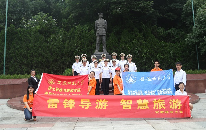 当天,安师大赴省内爱国主义教育基地“雷锋导游”志愿服务团队走进“全国爱国主义教育基地”——芜湖市王稼祥纪念馆,充分利用自身所学旅游管理专业知识和技能,积极融入、主动作为,承担了全馆的导游讲解工作,服务参观人员,介绍革命先烈王稼祥同志的生平事迹,再一次重温革命年代的峥嵘岁月。活动得到了前来参观的芜湖市海事局领导的高度评价与肯定,并合影留念;同时也得到了芜湖市电视台的跟踪采访。