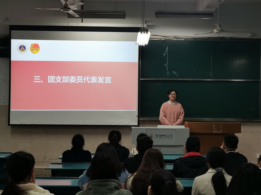 会议伊始,全体同学齐唱团歌。议程第二项,由团支书徐雨菲向大会做支部工作汇报:上一学年,团支部开展各类主题团日活动6次,青年大学习网上主题团课全员参与,30位团员已被列为入党积极分子。议程第三项,团支部委员成员舒玉茹代表发言,她表示非常感谢每位同学都积极参加每次团日活动,希望和全体同学一起努力,共同将支部建设的更好。随后,徐雨菲向大会汇报此次团员评议工作的具体开展情况,并宣读优秀团员名单。议程第五项,各团小组组长汇报本学年以来工作情况。最后,全体团员重温入团誓词,庄严宣誓。
