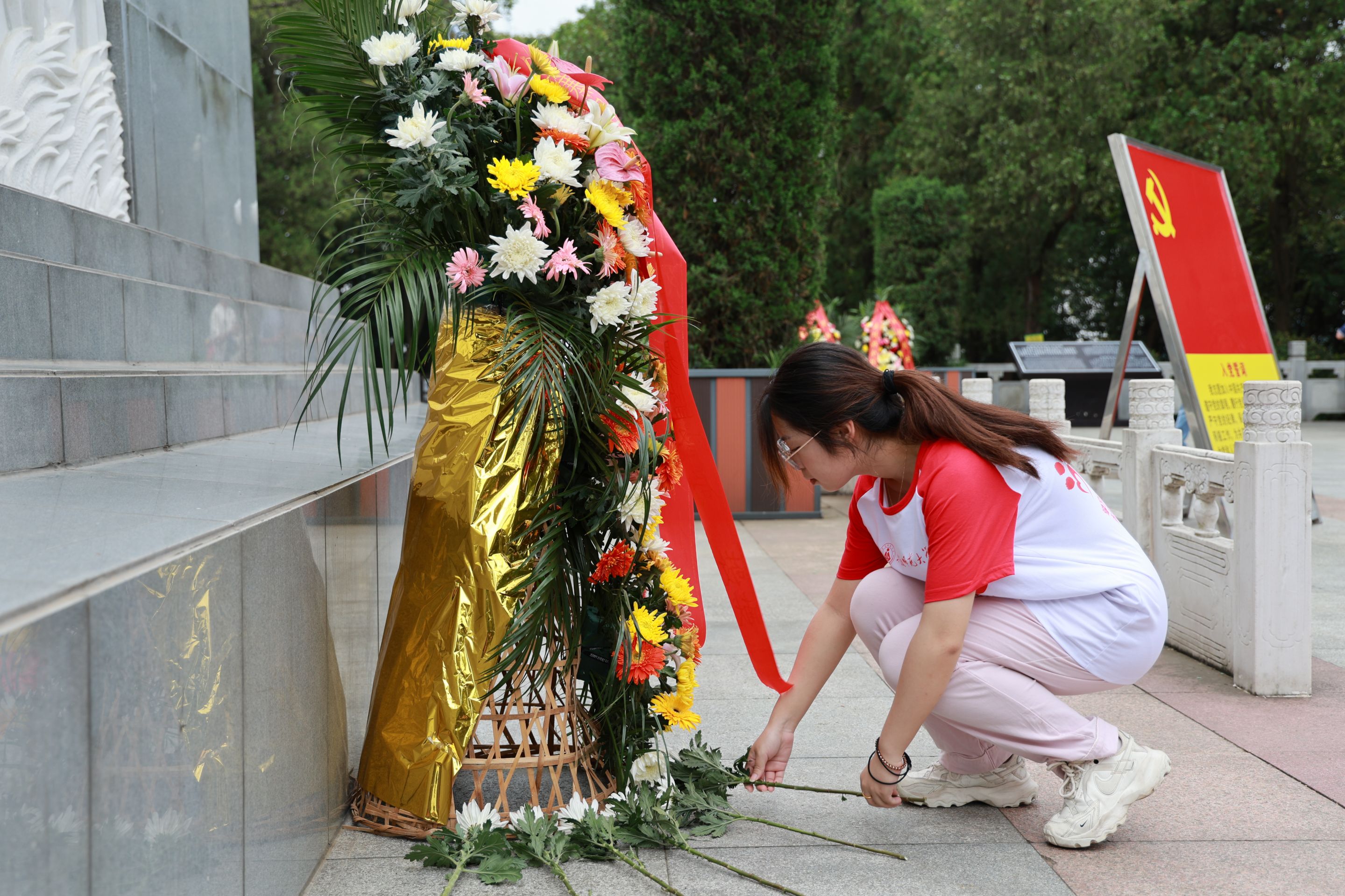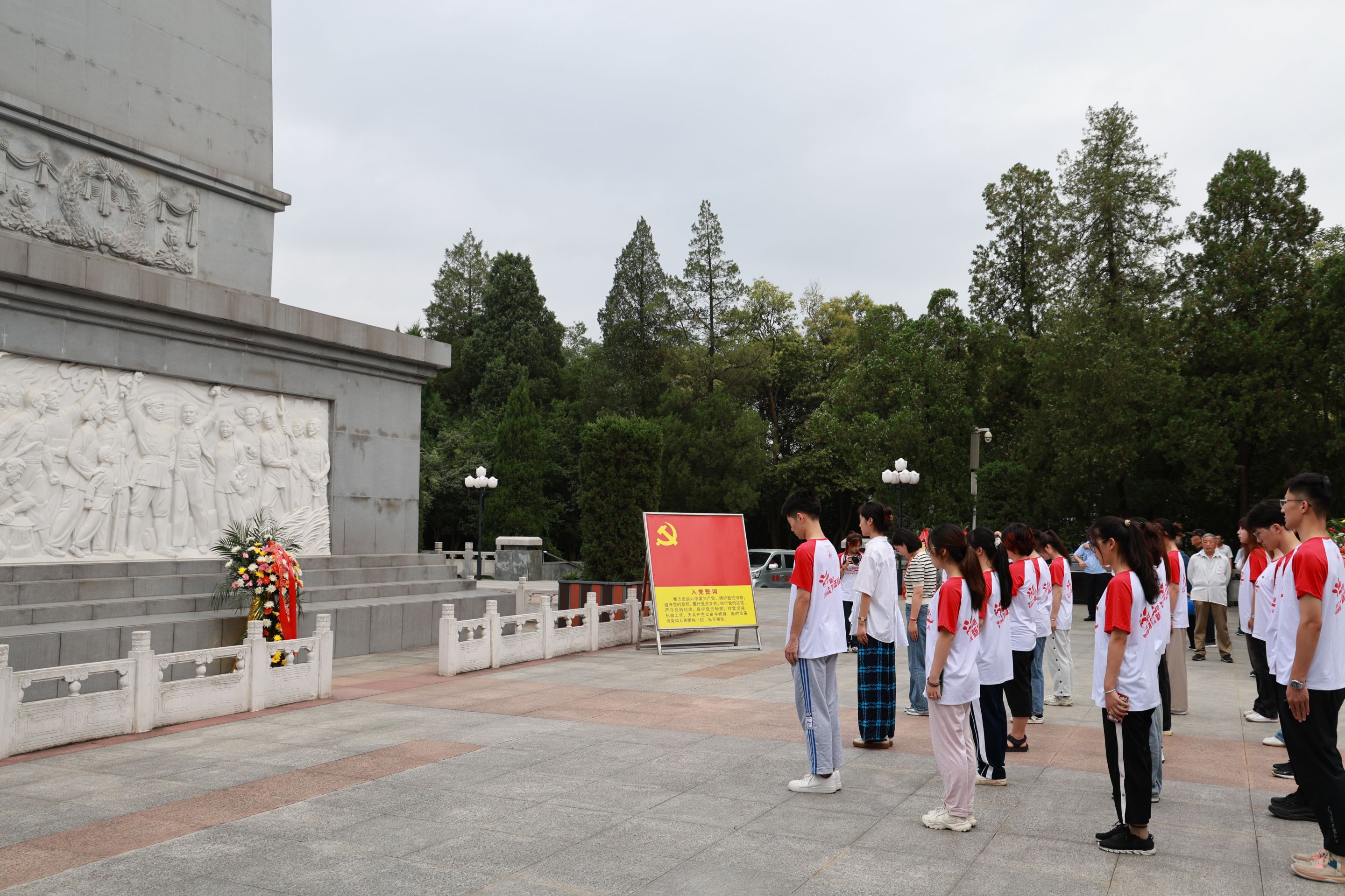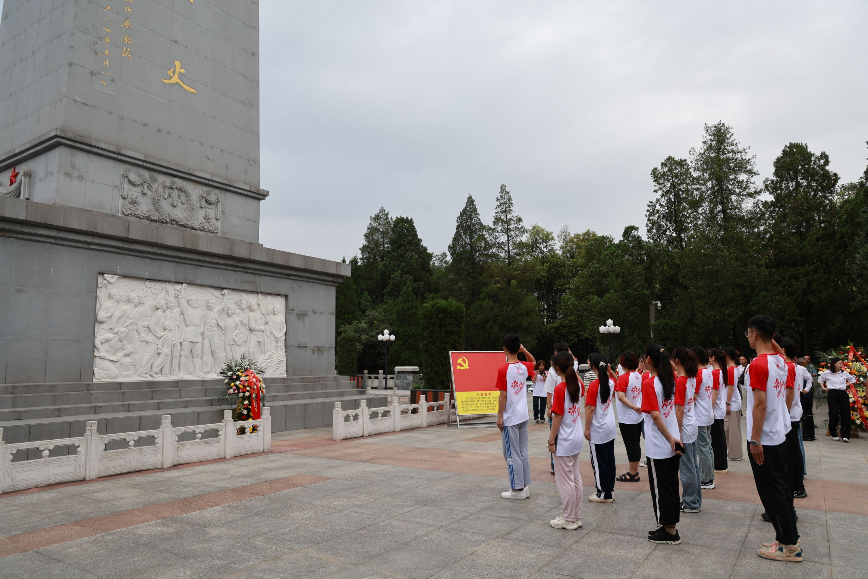 清晨,团队全体成员身着队服,佩戴党徽、团徽,集中于金寨县红军广场,在红军纪念塔前鞠躬致敬、瞻仰祭拜、敬献鲜花,团队师生默哀三分钟,共同缅怀英雄烈士。